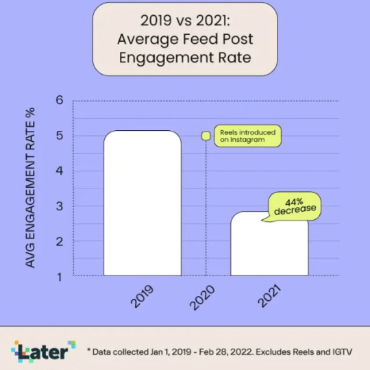 “The average engagement rate for feed posts (excluding Reels and IGTV) has decreased by 44% since 2019.”